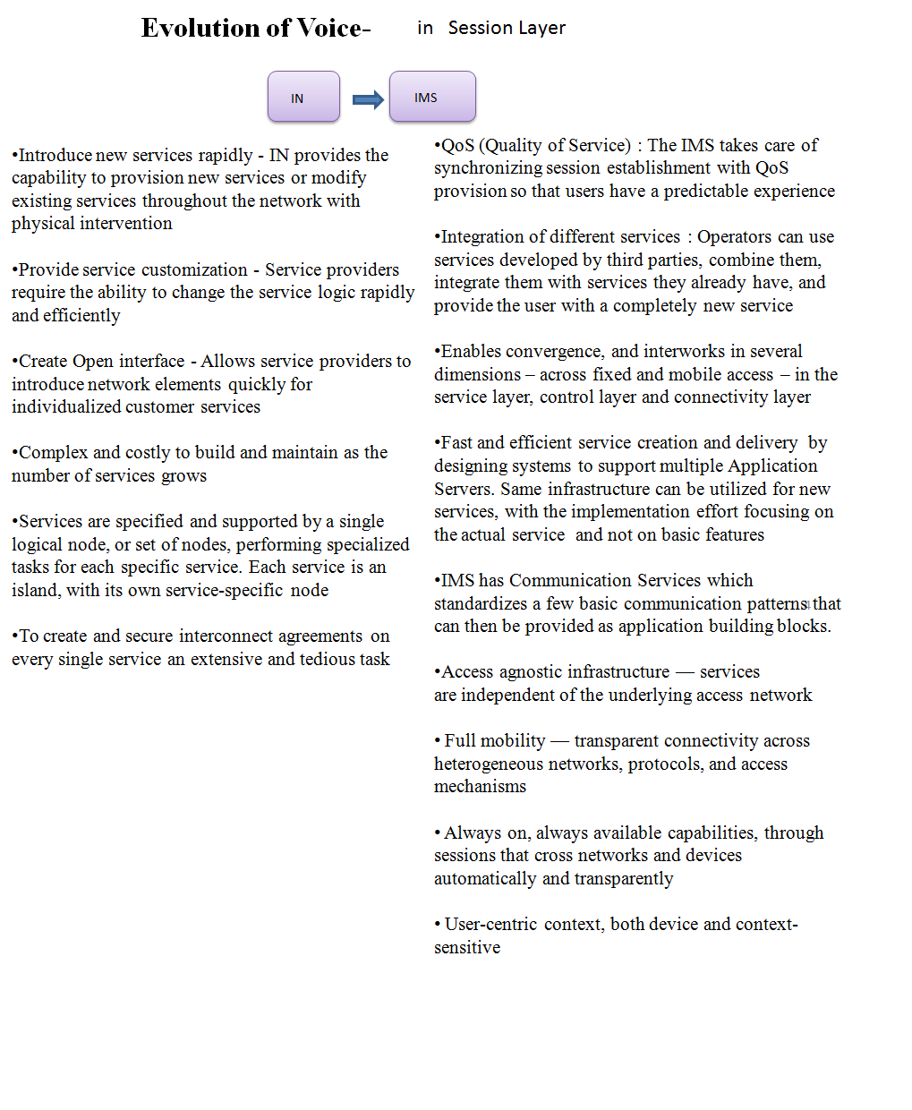 NGN was implemented globally as a means to change the cost base, agility and service capabilities of telecoms providers. The evolved architecture for the transition is one that provides flexibility to service providers by enabling them to deploy new services on IP based technologies, while leveraging existing services and infrastructure as long as it makes sense. This post describes the evolution of voice communication in access , transport and session layers respectively.